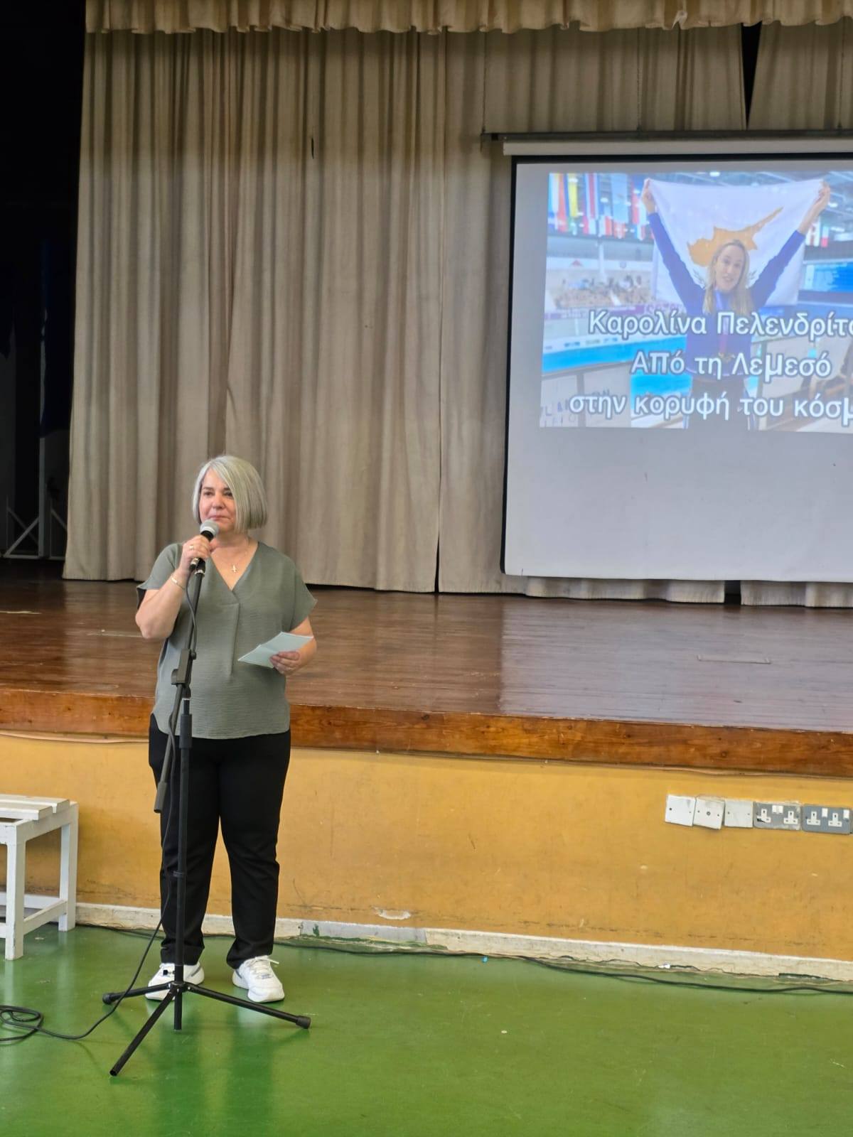 Σήμερα, είχαμε την τιμή και τη χαρά να φιλοξενήσουμε στο Σχολείο μας την Κύπρια Χρυσή Παραολυμπιονίκη κ. Καρολίνα Πελενδρίτου μαζί με τον σκύλο-οδηγό της.